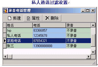 。。通過(guò)對(duì)某些特殊電話號(hào)碼的禁止錄音設(shè)置,DVS將自動(dòng)過(guò)濾該號(hào)碼進(jìn)行不錄音處理,以滿足私人通話及特殊場(chǎng)合的需要。