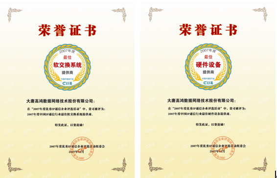 日前,由C114中國通信網主辦的“2007年度優(yōu)秀IP通信企業(yè)評選活動”圓滿結束。大唐高鴻數(shù)據網絡技術股份有限公司(以下簡稱“大唐高鴻”)憑借雄厚實力喜獲“2007年度中國IP通信行業(yè)最佳軟交換系統(tǒng)提供商”和“2007年度中國IP通信行業(yè)最佳硬件設備提供商”兩項大獎。這是大唐高鴻繼2007年4月榮獲中國VoIP論壇“2006年最佳中繼網關提供商”和“2006最佳VoIP解決方案提供商”兩項大獎之后的又一次實至名歸。