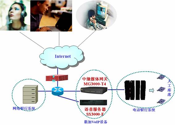 如圖,新加SIP融合通信平臺(tái)SS3000-E,完成客戶(hù)端軟電話(huà)的注冊(cè)、呼叫控制等功能;部署中繼媒體網(wǎng)關(guān)連接數(shù)據(jù)網(wǎng)絡(luò)和電話(huà)銀行系統(tǒng)的程控交換機(jī)。