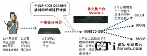 400業(yè)務(wù)又稱“主被叫分?jǐn)偢顿M(fèi)業(yè)務(wù)”,即為客戶提供一個(gè)全國范圍的400號碼,并把對該號碼的呼叫接至被叫客戶事先規(guī)定目的地(電話號碼或呼叫中心)。通常是主叫(撥打400的人)付市話費(fèi),被叫(擁有400號碼的客戶)付長途費(fèi)(主叫地區(qū)到目的地之間)SS3000-E適時(shí)推出了支持400業(yè)務(wù)的功能,即“被叫計(jì)費(fèi)”。按照下圖的指示,利用SS3000-E的被叫計(jì)費(fèi)功能,本次通話的費(fèi)用部分計(jì)在了4008123456這個(gè)號碼上。