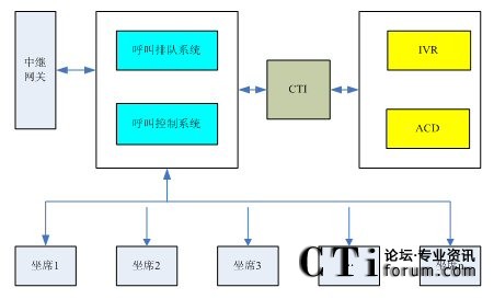 呼叫排隊(duì)系統(tǒng)首先將進(jìn)入系統(tǒng)的呼叫進(jìn)行排隊(duì),并將新來的呼叫上報(bào)給IVR系統(tǒng)。IVR系統(tǒng)向排隊(duì)的用戶播放提示音樂,同時(shí)ACD系統(tǒng)根據(jù)呼叫分配策略選擇一個(gè)空閑的坐席。在選定坐席以后,CTI接口將呼叫控制命令傳到呼叫控制系統(tǒng),呼叫控制系統(tǒng)將呼叫轉(zhuǎn)接到指定的坐席。坐席人員開始對(duì)客戶的呼叫進(jìn)行應(yīng)答受理。