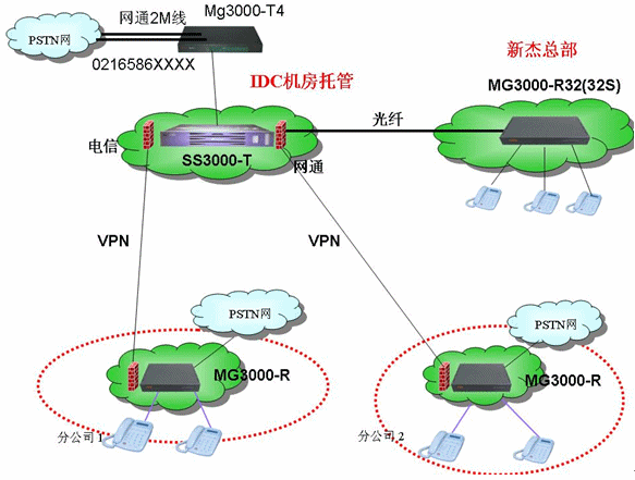- 各地全部采用MG3000-R,通過(guò)VPN注冊(cè)到軟交換平臺(tái)上,S口接普通電話(huà),O口接原來(lái)的模擬線(xiàn),整個(gè)系統(tǒng)通過(guò)各地-R的O口實(shí)現(xiàn)長(zhǎng)途落地的功能。