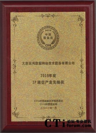 在評(píng)選工作中,通過(guò)專(zhuān)家評(píng)選以及廣大網(wǎng)友投票選舉,高鴻股份數(shù)據(jù)網(wǎng)絡(luò)技術(shù)股份有限公司(以下簡(jiǎn)稱(chēng)“高鴻股份”)憑借自身雄厚實(shí)力和優(yōu)良服務(wù),在2010年的工作得到了大家充分的肯定,喜獲 “IP通信產(chǎn)業(yè)先鋒獎(jiǎng)”獎(jiǎng)項(xiàng)。