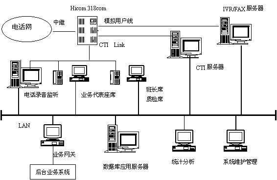 主要包括:Siemens Hicom 318com交換機、CTI服務器、IVR/FAX服務器、業(yè)務代表座席、班長和質檢座席、電話錄音監(jiān)聽系統(tǒng)、數(shù)據(jù)庫應用服務器、統(tǒng)計分析工作站、系統(tǒng)維護管理工作站、業(yè)務網(wǎng)關、網(wǎng)絡系統(tǒng),其邏輯結構下圖所示。
