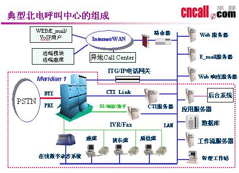 總結(jié)多年呼叫中心的研發(fā)經(jīng)驗,華呼在中高端呼叫中心建設(shè)上推薦極高性價比的基于北電Meridian 1 Option 11C交換機平臺加華呼CTI Link M1D中間件的呼叫中心解決方案。該解決方案的主要特點:以中低端的價位建立起高端的高可靠性、功能全面多樣的呼叫中心,提供包括語音、傳真、E-mail、 Internet及視頻等在內(nèi)的多媒體呼叫中心服務(wù)。同時用戶可根據(jù)需求靈活增加各個功能模塊以實現(xiàn)更完善的功能。