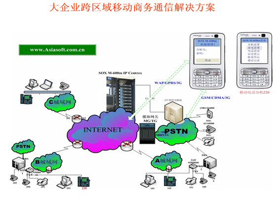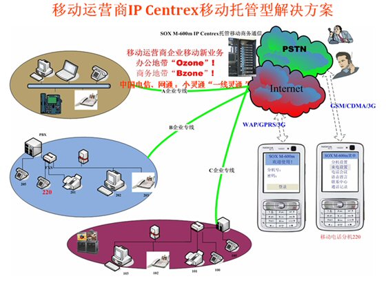 Mail,可發(fā)起WAP電話會(huì)議,可訪問(wèn)企業(yè)的CRM、ERP等應(yīng)用軟件并集成點(diǎn)擊呼叫等等)。不僅移動(dòng)運(yùn)營(yíng)商可以替代第一代的移動(dòng)總機(jī),固網(wǎng)運(yùn)營(yíng)商采用SOX-M移動(dòng)軟交換也可以輕松的開(kāi)展移動(dòng)總機(jī)(小靈通或手機(jī))的業(yè)務(wù)了,但SOX-M系統(tǒng)融合移動(dòng)運(yùn)營(yíng)商的無(wú)線互聯(lián)網(wǎng)數(shù)據(jù)業(yè)務(wù)將產(chǎn)生更大的利于企業(yè)應(yīng)用的前景,移動(dòng)總機(jī)(語(yǔ)音+WAP)的融合應(yīng)用成為第二代移動(dòng)總機(jī)殺手級(jí)應(yīng)用,令移動(dòng)總機(jī)如虎添翼。