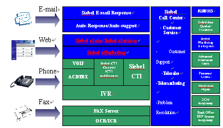 電子商務(wù)網(wǎng)站的運(yùn)作和企業(yè)網(wǎng)站的建設(shè),為其帶來了更多的市場商機(jī),嶄新的客戶接觸的機(jī)會?蛻粼谝幻腌妰(nèi)就能決定是選擇你還是別人,可以說未來網(wǎng)戰(zhàn)、傳統(tǒng)企業(yè)的競爭就是客戶關(guān)系的競爭;網(wǎng)站要生存,企業(yè)要發(fā)展,關(guān)鍵要在發(fā)展客戶關(guān)系上下功夫。如何涉足CRM領(lǐng)域,如何盡快地利用CRM先進(jìn)的客戶關(guān)系管理理念,是擺在網(wǎng)站和傳統(tǒng)企業(yè)面前的一個棘手問題。以基于Siebel .COM應(yīng)用為涉足CRM的切入點(diǎn),使企業(yè)能夠更好地實施電子商務(wù)計劃,積極發(fā)展基于Web的客戶關(guān)系管理,最終使網(wǎng)站和企業(yè)真正成為接觸客戶、了解客戶、服務(wù)于客戶的商務(wù)平臺,繼而不斷向完整的企業(yè)級CRM目標(biāo)邁進(jìn)。圖七展示出完整的基于Siebel .COM的CRM視圖。