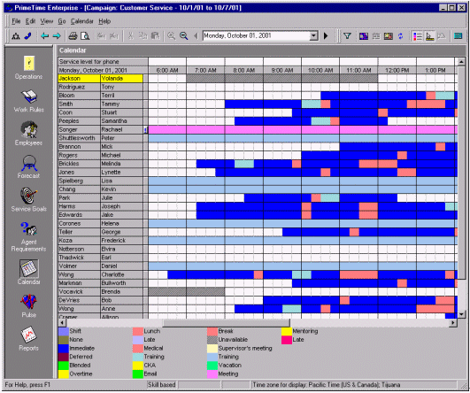 絕大多數(shù)的WFMS可以通過歷史數(shù)據(jù)和人員情況自動生成排班表。而且它也只是簡單的根據(jù)呼叫中心的運(yùn)營時間來排班。舉個例子,某個呼叫中心在排班是有兩個班,一個工作時間是早7點(diǎn)到下午3點(diǎn),另一個是早九點(diǎn)到晚五點(diǎn),這就意味著不僅要安排早、晚休息,還要顧及到午休的時間。休息的安排要保證能夠在電話的持續(xù)中也能有持續(xù)的人員保證電話量。在這個自動化軟件的之中還有一個因素要能夠?qū)崿F(xiàn)自動化--人的因素。例如:Mary和Jane想同時去吃午餐,然而自動化的排班表并不是這樣的。然而主管根據(jù)當(dāng)時的話務(wù)量情況和工作狀況以及工作規(guī)范批準(zhǔn)了Mary和Jane共享午餐的要求,而WFMS就要能夠處理這樣很有可能發(fā)生,而且是合理的情況。排班表的更改應(yīng)該就是簡單的拖拽圖標(biāo)就應(yīng)該能夠?qū)崿F(xiàn)的功能,并且能夠在這種更改會對預(yù)測的話務(wù)量差生不好影響時,拒絕這種拖拽行為。