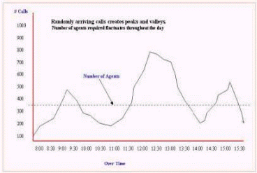 Inbound的來話量成不規(guī)則的波形圖,形成這種不規(guī)則波形圖中波峰和波谷的原因是在這些波峰和波谷工作的員工數(shù)量。(見圖8.來話量的分布圖)這將對在一天中的每個時段能夠分配最理想的員工來工作造成了最大的困難。一個小時能可能從來話量的波峰到達(dá)波谷,管理人員如何排班來匹配話務(wù)量對人員的要求,這是很多人的困惑。下圖描繪了某個呼叫中心8小時來話量分布情況。