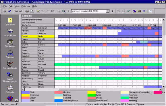 人員預(yù)測是一個每天、每周、每月、每年都需要作的工作計劃,為了能夠平衡呼叫中心人員的工作量和人員的可用性。通過將歷史數(shù)據(jù)和人員數(shù)據(jù)整合、加以分析,并借以WFMS體現(xiàn)出分配多少員工就可以達(dá)到既定的服務(wù)水準(zhǔn)。一旦需要員工數(shù)量被估算出來,那么工作安排也就是每天、每周、每月、每天的排班表的輪廓也就出來了。絕大多數(shù)的WFMS軟件的界面和操作都很相似,最主要的就是內(nèi)容就是要包含員工的姓名、員工的工作時間、員工的其他日程(最小單位是15分鐘),并且能夠提供具有多個管理軟件接口,和多種不同的管理方式。圖9.就是一個典型的人員排班表,以15分鐘為單位體現(xiàn)人員的工作安排。附加選項(xiàng)還可以包含"休假""遲到""曠工"等等,并且這排班表還可以通過歷史數(shù)據(jù)體現(xiàn)出哪個時段可能出現(xiàn)人員不足哪個時段容易出現(xiàn)人員過,F(xiàn)象。