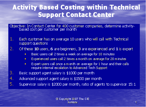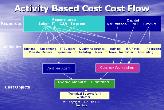 呼叫中心業(yè)務(wù)包括大量單獨(dú)的行動(dòng) — 行動(dòng)成本法(ABC)使我們跟蹤那些行動(dòng)以至于更清楚地了解支持一個(gè)客戶的所需事項(xiàng)。傳統(tǒng)上,呼叫中心成本是根據(jù)投入來(lái)衡量的:人數(shù),設(shè)備量,設(shè)施的規(guī)模。為了了解服務(wù)一個(gè)客戶所花費(fèi)的成本量,呼叫中心的主管必須確定這些行動(dòng)如何與該客戶相聯(lián)系的。只有做到這一點(diǎn),行業(yè)才能知道來(lái)自該客戶的收入是否超出為其提供服務(wù)所產(chǎn)生的成本。如果服務(wù)的成本大于收入,那么這個(gè)客戶對(duì)于行業(yè)來(lái)說(shuō)是無(wú)利可圖的,所以確定哪些客戶有利可圖和哪些客戶無(wú)利可圖是很重要的,這樣,行業(yè)才可以根據(jù)客戶定價(jià)和客戶服務(wù)策略有利地進(jìn)行管理。