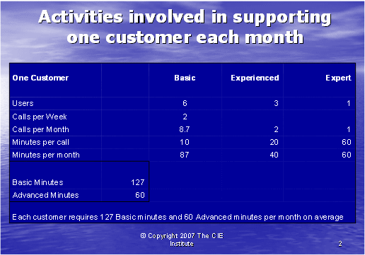 圖表1為我們提供了重要的信息,有助于我們計(jì)算一般的客戶在基礎(chǔ)和高級(jí)兩種技術(shù)支持中所需的技術(shù)支持的通話時(shí)長(zhǎng)。我們需要區(qū)分這兩種技術(shù)支持,因?yàn)樘峁└呒?jí)技術(shù)支持的座席的月薪是2000美元,比提供基礎(chǔ)技術(shù)支持,月薪為1000美元的座席每月所花的成本要高。那么,面臨有經(jīng)驗(yàn)的客戶使用者時(shí)該怎么做呢?因?yàn)橹挥袑?zhuān)業(yè)客戶使用者才能要求高級(jí)座席支持,所以他們的需要似乎可以由與初級(jí)客戶使用者打交道的基礎(chǔ)座席處理。