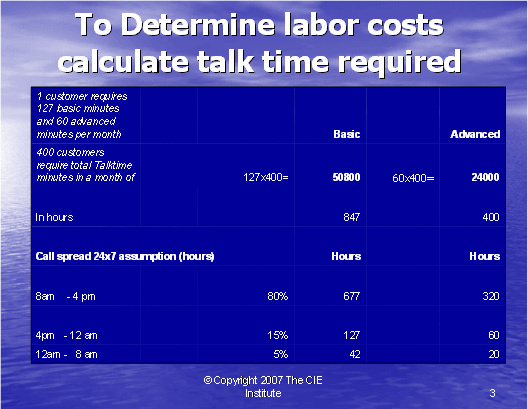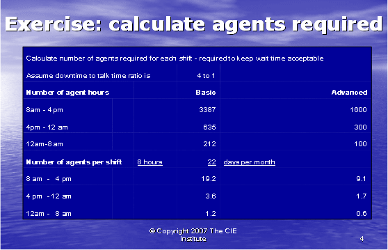 在我們計(jì)算出所需的座席數(shù)之前,我們必須了解一個(gè)座席的付薪工作時(shí)間和他的通話時(shí)長(zhǎng)的區(qū)別,通話時(shí)長(zhǎng)是座席真正花在電話上面對(duì)客戶的時(shí)間。一個(gè)座席不會(huì)一直處理電話,其它的時(shí)間用于培訓(xùn),休息,與主管獨(dú)處,部門(mén)會(huì)議,公司內(nèi)部為給客戶提供準(zhǔn)確的回答而進(jìn)行研究,對(duì)內(nèi)對(duì)外寫(xiě)郵件,準(zhǔn)備下一個(gè)客戶的電話。在每個(gè)呼叫中心中,通話時(shí)長(zhǎng)和停工時(shí)長(zhǎng)的比率是不同的。對(duì)于復(fù)雜易變的產(chǎn)品,花在培訓(xùn)上的時(shí)間會(huì)更多。在新產(chǎn)品被頻繁介紹的呼叫中心,就需要更多的時(shí)間去研究關(guān)于新產(chǎn)品的回答。為了更精確,一個(gè)座席一周的工作時(shí)長(zhǎng)應(yīng)該與其通話時(shí)長(zhǎng)相比較,以便真正確定通話時(shí)長(zhǎng)與停工時(shí)長(zhǎng)的比率。在我們的例子中,我們假設(shè)停工時(shí)長(zhǎng)和通話時(shí)長(zhǎng)的比率為4:1,也就是說(shuō),每1小時(shí)通話時(shí)間,相對(duì)應(yīng)4小時(shí)停工時(shí)間。