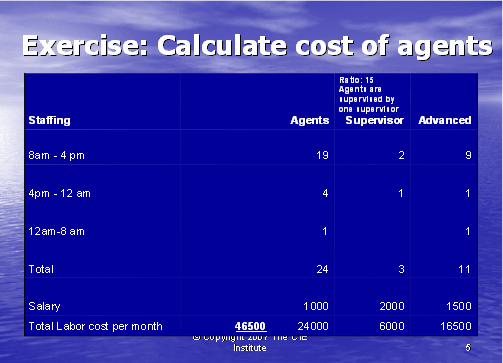 我們下一步就是計(jì)算出主管的成本。每次排班至少需要一個(gè)主管,如果這一排班的座席數(shù)要少一些,主管則也應(yīng)該能夠處理一些技術(shù)支持的電話。在這個(gè)例子中,我們將假設(shè)主管擁有高級(jí)支持座席的技術(shù)技巧。在圖表5中,你將看到我們使用了圖表4所得出的座席數(shù),并假設(shè)這是每次排班話務(wù)量中所需的各種類(lèi)型員工的數(shù)量:基礎(chǔ),高級(jí)和主管。我們同時(shí)用圖表1中的薪資去計(jì)算座席和主管支持400個(gè)客戶的總成本。通過(guò)把每種座席單獨(dú)的成本相加(24個(gè)基礎(chǔ)座席,11個(gè)高級(jí)座席和3個(gè)主管),得出每月的人工成本為46,500美元。