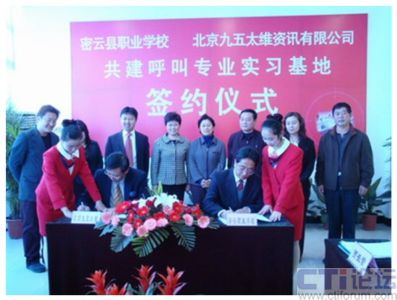 12月18日上午,密云縣職業(yè)學(xué)校與北京九五太維資訊有限公司校企合作共建呼叫專業(yè)實(shí)習(xí)基地簽約儀式在密云縣職業(yè)學(xué)校隆重舉行,市教委職成處處長李敏,縣委常委副縣長王春林、副縣長錢福生、副縣長徐芳出席簽約儀式并發(fā)表了講話。密云縣教委主任李鐘勤,北京九五太維資訊有限公司董事長汪遠(yuǎn),首席執(zhí)行官李寶民及其培訓(xùn)師團(tuán)隊(duì),密云縣經(jīng)濟(jì)開發(fā)區(qū)總公司及部分入?yún)^(qū)呼叫企業(yè)出席了簽約儀式。此次活動(dòng)標(biāo)志著北京呼叫中心產(chǎn)業(yè)基地人才培養(yǎng)工作步入正軌,隨著以密云縣職業(yè)學(xué)校為主體的人才培養(yǎng)模式的確立,長期困擾呼叫行業(yè)人才短缺的困難有望得到解決。