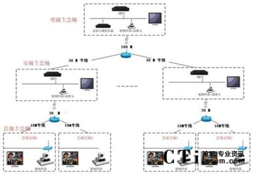 本方案整體采用基于IP網(wǎng)絡(luò),在省、市中心機(jī)房放置MCU,通過(guò)網(wǎng)線接入核心交換網(wǎng)絡(luò);在會(huì)議室放置視頻終端,通過(guò)郵政專網(wǎng)進(jìn)行互聯(lián)。一級(jí)系統(tǒng)以省中心會(huì)議室為主會(huì)場(chǎng),下屬各市會(huì)議室為分會(huì)場(chǎng)組成邏輯星形拓?fù)浣Y(jié)構(gòu);二級(jí)系統(tǒng)以市州郵政局會(huì)議室為主會(huì)場(chǎng),下屬各區(qū)縣郵政局會(huì)議室為分會(huì)場(chǎng)。兩級(jí)系統(tǒng)通過(guò)MCU級(jí)聯(lián)互通,形成一個(gè)樹形的拓?fù)浣Y(jié)構(gòu)。系統(tǒng)主要由全視頻會(huì)議管理系統(tǒng)、純硬件MCU、純硬件1080P高清會(huì)議終端等組成,采用MCU為中心的星形結(jié)構(gòu)建立一個(gè)數(shù)字連接的、專業(yè)的視頻會(huì)議系統(tǒng)。視頻會(huì)議系統(tǒng)可由省郵政廳視頻會(huì)議中心控制,任意切換參會(huì)市、州(分中心)、縣、市、區(qū)(終端)的會(huì)議畫面。視頻會(huì)議系統(tǒng)可以指定任意參會(huì)單位發(fā)言并實(shí)現(xiàn)全省會(huì)場(chǎng)統(tǒng)一的畫面切換。視頻會(huì)議系統(tǒng)可實(shí)現(xiàn)省郵政局集中控制與管理,易于使用,能進(jìn)行遠(yuǎn)程管理、遠(yuǎn)程維護(hù)、可降低維護(hù)成本。通過(guò)授權(quán),各級(jí)單位可自行組織、控制會(huì)議,方便各級(jí)單位的使用。