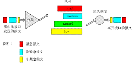 在報(bào)文到達(dá)路由設(shè)備接口后首先對(duì)報(bào)文進(jìn)行分類(lèi),然后按照?qǐng)?bào)文所屬的類(lèi)別讓報(bào)文進(jìn)入所屬隊(duì)列的尾部,在報(bào)文發(fā)送時(shí)按照優(yōu)先級(jí)總是在所有優(yōu)先級(jí)較高的隊(duì)列中的報(bào)文發(fā)送完畢后再發(fā)送低優(yōu)先級(jí)隊(duì)列中的報(bào)文,這樣在每次發(fā)送報(bào)文時(shí)總是將優(yōu)先級(jí)高的報(bào)文先發(fā)出去,保證了屬于較高優(yōu)先級(jí)隊(duì)列的報(bào)文有較低的時(shí)延與丟失率。