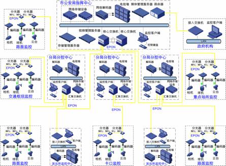 一般說來,城市監(jiān)控系統(tǒng)的網(wǎng)絡(luò)承載平臺要求建設(shè)專網(wǎng)或者VPN網(wǎng)絡(luò)。對于光纖資源較為豐富的城區(qū),可以使用數(shù)字SFP光纖接入,一個(gè)前端攝像頭對應(yīng)一條光纖;在光纖資源較少的區(qū)域,可以使用EPON(無源光網(wǎng)絡(luò))技術(shù),一芯光纖上可以同時(shí)接入多個(gè)前端攝像頭,大量節(jié)約了光纖資源和光纖租用成本;對于較為復(fù)雜的環(huán)境,不適合進(jìn)行布線,可以采用無線接入的方式,降低施工成本。