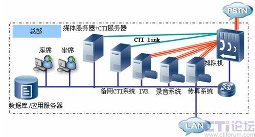 北京為總部中心,將部署CTI服務(wù)器、IVR服務(wù)器、錄音系統(tǒng)、傳真系統(tǒng)、文件服務(wù)器及相關(guān)業(yè)務(wù)數(shù)據(jù)庫(kù)服務(wù)器,為各個(gè)營(yíng)業(yè)網(wǎng)點(diǎn)提供業(yè)務(wù)支撐。總部將對(duì)整個(gè)網(wǎng)絡(luò)進(jìn)行管理,包括平臺(tái)配置、業(yè)務(wù)管理、數(shù)據(jù)管理、人員調(diào)度等。在總部CTI系統(tǒng)我們采用主備模式,確保了在出現(xiàn)網(wǎng)絡(luò)故障主CTI系統(tǒng)無(wú)法提供服務(wù)情況下,備用CTI系統(tǒng)將接替主CTI系統(tǒng)工作,確保了整個(gè)系統(tǒng)的正常工作。硬件平臺(tái)方面,UAP我們采用了雙主控板雙電源供電工作模式,這對(duì)系統(tǒng)長(zhǎng)期穩(wěn)定工作提供了保障?偛客瑫r(shí)也部署北京農(nóng)村商業(yè)銀行300個(gè)坐席人員,這些坐席人員可以按照業(yè)務(wù)進(jìn)行區(qū)分,大部分坐席精通一般的業(yè)務(wù),為普通客戶提供優(yōu)質(zhì)服務(wù),少部分坐席(專業(yè)坐席)人員為高價(jià)值客戶提供高級(jí)的專業(yè)的優(yōu)質(zhì)服務(wù),在普通坐席比較忙時(shí),專業(yè)坐席可以為普通用戶提供服務(wù),坐席中,還有極少部分可以充當(dāng)坐席管理員角色,他們也可以監(jiān)控各個(gè)分中心坐席服務(wù)的質(zhì)量,對(duì)有問(wèn)題服務(wù)可以實(shí)現(xiàn)監(jiān)聽、監(jiān)察、和強(qiáng)拆功能,及時(shí)的保證服務(wù)質(zhì)量,維護(hù)了企業(yè)形象。