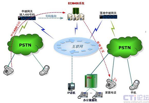 申請(qǐng)到400號(hào)碼的服務(wù)商,通過(guò)TG中繼網(wǎng)關(guān),把400號(hào)指向ECM400系統(tǒng),從而在IP網(wǎng)和PSTN網(wǎng)上建立了一個(gè)完美的過(guò)渡橋梁,對(duì)不同的通訊方式進(jìn)行了有效融合,能充分整合雙網(wǎng)的各種資源和功能,從而達(dá)到為企業(yè)提供更多、更好服務(wù)的目的。