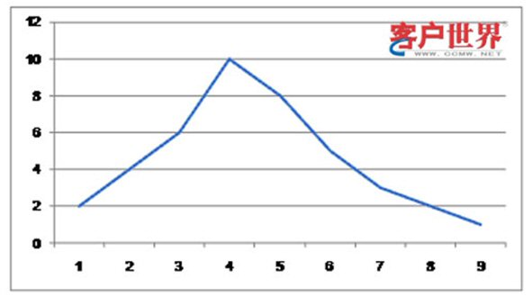 首先我們看到常態(tài)圖對(duì)呼叫中心分析的運(yùn)用。利用最小方差管理法時(shí),經(jīng)常要制作常態(tài)圖來進(jìn)行分析。常態(tài)圖其實(shí)是一張很簡(jiǎn)單的圖,例如你統(tǒng)計(jì)了你同事每天到公司上班所需的時(shí)間:5分鐘之內(nèi)的,有2個(gè);10分鐘的有4個(gè);15分鐘的有6個(gè);20分鐘的有10個(gè);25分鐘的有8個(gè);30分鐘的有5個(gè);35分鐘的有3個(gè);40分鐘的有2個(gè);超過40分鐘的有1個(gè)。這時(shí)你畫一張常態(tài)圖,就會(huì)得到下面的圖(縱坐標(biāo)代表人數(shù);橫坐標(biāo)代表所花時(shí)間):