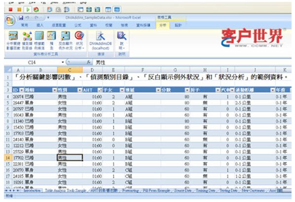 前面談到的Excel功能,都是在Excel 2003可以輕易實(shí)現(xiàn)的,但在Excel 2007,有了一個(gè)重大的突破,就是提供了一系列的數(shù)據(jù)挖掘工具。微軟把本來屬于非常高深的數(shù)據(jù)挖掘功能,做到了Excel里面,最棒的是,你完全不必懂?dāng)?shù)據(jù)挖掘,也不必懂類似MS SQL這種讓人一聽就頭昏的數(shù)據(jù)庫管理。