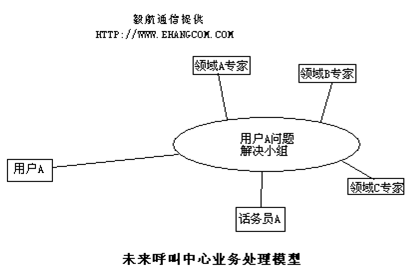 未來的呼叫中心里服務每個用戶的不是單個話務員,而是一個隨需組建的專家組。話務員根據用戶的問題,在適當的時候邀請相應專家參加到用戶問題解決小組,話務員負責小組內的信息協調和流程控制。比如用戶投訴沒有收到訂貨,話務員可以加入該用戶的跟蹤業(yè)務員,當從業(yè)務員處了解到該用戶有欠款記錄,那么話務員可以把財務人員加入到臨時問題解決小組,財務人員可以準確的告訴用戶是那筆款有問題,需要處理,這樣可以當場讓用戶明白問題的根源,并還能得到財務人員的處理建議和后續(xù)操作流程指導,做到溝通高效,有效,而且真正能減少抱怨,提高業(yè)務效率。