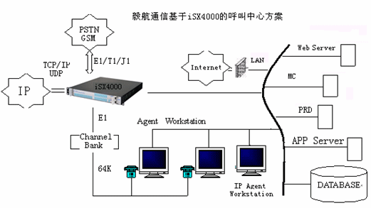 相對于現在的兩種主流呼叫中心方案,毅航通信基于iSX4000呼叫中心解決方案直接整合了Internet的接入。傳統(tǒng)由IVR完成的操作也可以通過Web頁面上的流程實現,這樣用戶通過下拉菜單、簡單填寫、點擊按鈕等操作完成客戶識別、業(yè)務識別等操作,這些流程完成后,通過VoIP對呼叫中心呼入,由呼叫中心對呼入進行受理,再按照相應的原則分配到座席,座席再作相應的應答和處理,從而為客戶提供了一個通過Web站點直接進入呼叫中心的途徑,把Internet所具有的豐富信息資源和強大的功能賦予呼叫中心,它向客戶提供一個可訪問的Web站點,使得呼叫中心從“撥叫到交談(Dial to Talk)”發(fā)展到“點擊到交談(Click to Talk)”,通過Internet可以提供IP電話語音呼叫、Call Back、IP傳真、IM、E-mail等功能,擴展了通信渠道,一方面用戶可以實現免費接入到呼叫中心,另一方面企業(yè)能夠向更多的客戶提供優(yōu)質、方便的服務資源,而且由于這些資源的價格相對傳統(tǒng)通信便宜,使企業(yè)為客戶提供全國、乃至于全球服務成為可能,提高了企業(yè)客戶服務水平,增強了企業(yè)競爭力。毅航通信統(tǒng)一呼叫中心解決方案系統(tǒng)結構如圖所示:
