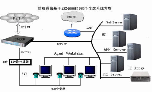 通過8個120路的分流器從iSX4000的中繼接口引入960路的坐席話機(jī)(或者坐席卡),單臺iSX4000能接入960路外部線路和960個內(nèi)部坐席。