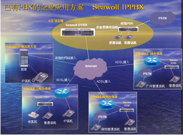 北京海狼網(wǎng)絡(luò)通信有限公司推出的Seawolf IPPBX解決方案切實(shí)從集團(tuán)企業(yè)的利益出發(fā),為客戶成功地降低了通訊成本。Seawolf IPPBX是一款功能強(qiáng)大的小型語音交換平臺(tái)設(shè)備。它將傳統(tǒng)的交換機(jī)技術(shù)與VOIP的先進(jìn)技術(shù)完美融合,提出了VOIP的企業(yè)級(jí)解決方案。此方案能大大縮減各大、中、小型企事業(yè)單位的通信費(fèi)用,同時(shí)增加員工的工作效率。隨著產(chǎn)品的不斷普及,Seawolf IPPBX將成為企業(yè)辦公不可缺少的一部分。此方案適合于已經(jīng)有PBX的公司,由于先期已經(jīng)投入了PBX設(shè)備,費(fèi)用昂貴,所以不會(huì)輕易被替換。在外地有多家分公司,使用傳統(tǒng)電話通訊費(fèi)用很高,希望能降低成本。并希望在分公司所在城市可以通過當(dāng)?shù)氐腜STN落地,節(jié)省長(zhǎng)途費(fèi)用。依照客戶的需求,我們制定了以下方案:海狼科技公司供稿 CTI論壇編輯