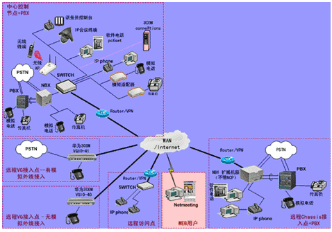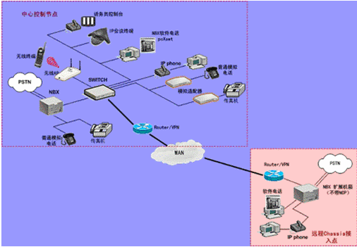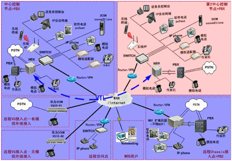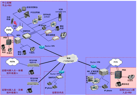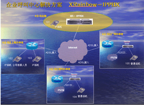 IPPBX將成為企業(yè)辦公不可缺少的一部分。此方案適合于已經(jīng)有PBX的公司,由于先期已經(jīng)投入了PBX設(shè)備,費(fèi)用昂貴,所以不會(huì)輕易被替換。在外地有多家分公司,使用傳統(tǒng)電話通訊費(fèi)用很高,希望能降低成本。并希望在分公司所在城市可以通過(guò)當(dāng)?shù)氐腜STN落地,節(jié)省長(zhǎng)途費(fèi)用。依照客戶的需求,我們制定了以下方案: