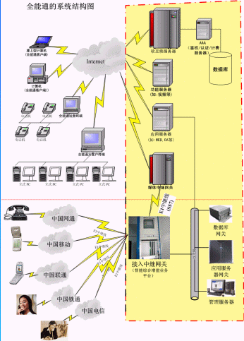 全能通顧名思義:各種網絡都能通(固定網、移動網、互聯(lián)網三網合一)。全能通核心目的是實現(xiàn)互聯(lián)網(Internet)用戶與固定網(PSTN)電話/小靈通用戶、移動網(PLMN)手機用戶之間無障礙通信,它不僅可以提供語音、數(shù)據(jù)、文本、視頻等多種媒體的信息服務,還提供了各種增值業(yè)務和網絡辦公等功能。