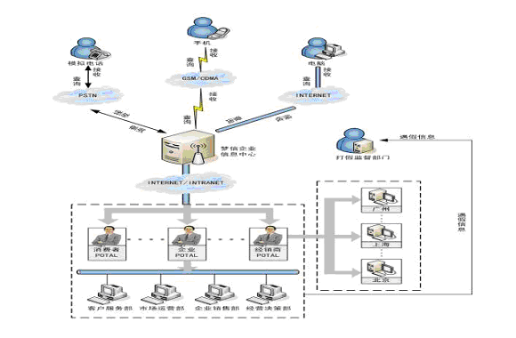根據(jù)企業(yè)需求自動(dòng)生成產(chǎn)品防偽碼,并標(biāo)注在產(chǎn)品上,當(dāng)用戶開或刮開產(chǎn)品標(biāo)識(shí)物時(shí),用手機(jī)將防偽碼發(fā)送到企業(yè)短信防偽認(rèn)證平臺(tái),平臺(tái)將自動(dòng)對(duì)產(chǎn)品的真?zhèn)芜M(jìn)行驗(yàn)證,并將結(jié)果立即反饋給用戶。