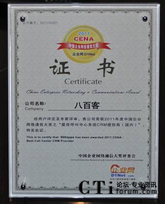 CTI論壇(ctiforum)10月31日消息(記者 張潔):10月19日,2011 秋季CENCE 中國企業(yè)網(wǎng)絡通信大會暨云計算高峰論壇在上海展覽中心盛大舉行。國內首家SaaS廠商八百客憑借連續(xù)在云計算領域的成熟技術以及在市場中的廣泛認可度,獲得“最佳呼叫中心系統(tǒng)CRM提供商”大獎。