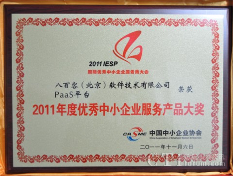 作為國內(nèi)首家SaaS廠商,八百客積極推動(dòng)云計(jì)算在中小企業(yè)中的宣傳與運(yùn)用。2006年,八百客在國內(nèi)率先推出管理自動(dòng)化開發(fā)平臺(tái)800APP, 它擴(kuò)展了按需服務(wù),并實(shí)現(xiàn)了客戶可根據(jù)需要自定制應(yīng)用程序,成為了改變應(yīng)用程序開發(fā)的一個(gè)新途徑。為表彰八百客在中小企業(yè)信息化中做出的杰出貢獻(xiàn),本次大會(huì)特別為八百客頒發(fā)了“2011年度優(yōu)秀中小企業(yè)服務(wù)產(chǎn)品大獎(jiǎng)”,此外還授予八百客總經(jīng)理李智 “2011年度優(yōu)秀中小企業(yè)服務(wù)明星大獎(jiǎng)”。