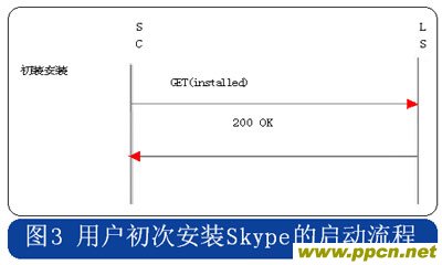 Skype的用戶終端啟動時,采用HTTP協(xié)議連接到注冊服務(wù)器,用戶初次安裝的啟動流程中攜帶“installed”的參數(shù),使用時啟動流程則在消息中攜帶“getlatestversion”參數(shù),具體流程分別見圖3和圖4。