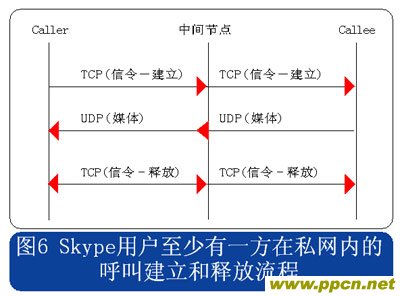 從上述流程圖可見,Skype的呼叫信令都采用TCP封裝,而媒體流則使用UDP封裝,當(dāng)有任何一方用戶位于限制UDP包的防火墻內(nèi)時,媒體流就會采用TCP封裝。另外當(dāng)Skype用戶至少有一方位于私網(wǎng)內(nèi)時,所有的信令和媒體消息都經(jīng)過一個或多個中間節(jié)點(diǎn)轉(zhuǎn)發(fā)。此時無需擔(dān)心用戶通話的媒體流因?yàn)榻?jīng)過中間節(jié)點(diǎn)轉(zhuǎn)發(fā)而被竊聽,因?yàn)镾kype采用了對消息進(jìn)行端到端加密的機(jī)制。