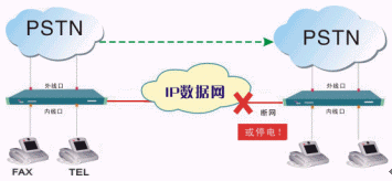 IP數(shù)據(jù)網(wǎng)故障或設(shè)備斷電時(shí),呼叫可自動(dòng)跳轉(zhuǎn)到PSTN市話網(wǎng),同時(shí)播放語(yǔ)音告警。
