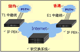 分布在各地的GV IPPBX,可以作為IP PBX平臺(tái)的網(wǎng)關(guān),所有注冊(cè)在IP PBX平臺(tái)下的話機(jī)可以分別通過(guò)各地的IP PBX網(wǎng)關(guān)落地,撥打普通電話,自由選擇最優(yōu)惠的話費(fèi)平臺(tái)。一臺(tái)GV IPPBX可以支持多達(dá)4路E1,等于120條外線。 |