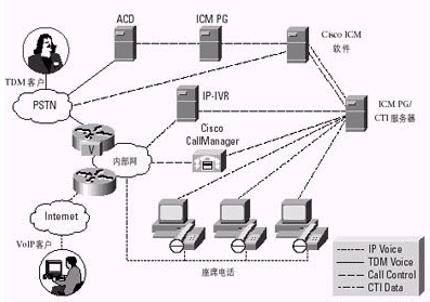 通過一個容納了ACD、IVR、Web和電子郵件服務(wù)器、桌面應(yīng)用以及其他內(nèi)容的計劃,Cisco ICM軟件使公司能夠利用Internet或PSTN實現(xiàn)與客戶的交互。