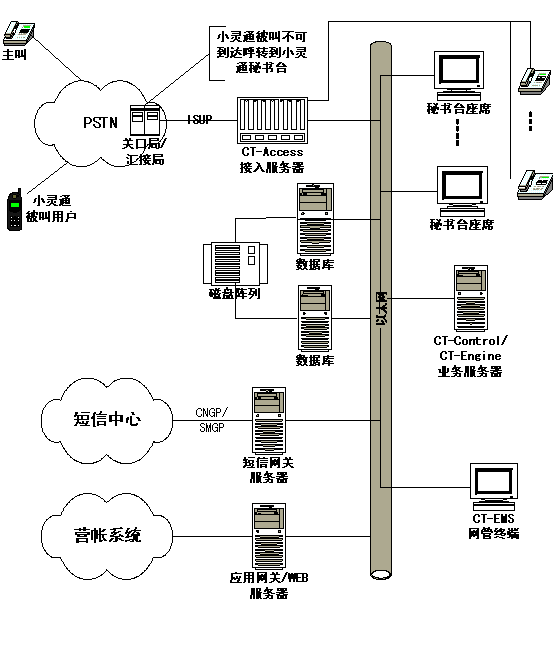 如上圖所示,小靈通秘書臺(tái)網(wǎng)絡(luò)拓?fù)鋱D,上圖中紅色虛線的左邊為運(yùn)營(yíng)商部分,紅線是接口部分, 紅色虛線的右邊是增加的小靈通秘書臺(tái)設(shè)備和工程實(shí)施部分。首先需要在小靈通網(wǎng)絡(luò)的關(guān)口局或者匯接局設(shè)置被叫不可到達(dá)(關(guān)機(jī)、忙、不在服務(wù)區(qū))呼叫前轉(zhuǎn),通過(guò)ISUP協(xié)議呼叫到小靈通秘書臺(tái)的CT-Access接入服務(wù)器,提取主叫號(hào)碼、被叫號(hào)碼、原被叫號(hào)碼,同時(shí)給主叫播放語(yǔ)音,"您撥的用戶無(wú)法接通,您可以選擇失話復(fù)得業(yè)務(wù),本業(yè)務(wù)每條短信收費(fèi)0.1元,漏話提示請(qǐng)按1號(hào)鍵,短信回叫請(qǐng)按2號(hào)鍵,轉(zhuǎn)人工請(qǐng)按9號(hào)鍵"。然后根據(jù)主叫的響應(yīng)選擇提供服務(wù)(業(yè)務(wù)流程見第3章)。小靈通秘書臺(tái)的業(yè)務(wù)部分由CT-Control/CT-Engine業(yè)務(wù)服務(wù)器和數(shù)據(jù)庫(kù)服務(wù)器組成,另外包括人工臺(tái)和短信網(wǎng)關(guān),短信網(wǎng)關(guān)通過(guò)CNGP(網(wǎng)通)、SMGP(電信)和短信中心網(wǎng)關(guān)接口,實(shí)現(xiàn)短信發(fā)送功能。業(yè)務(wù)網(wǎng)關(guān)和WEB服務(wù)器為可選部分,根據(jù)業(yè)務(wù)需要選配。