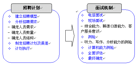 東軟呼叫中心充分挖掘東北地區(qū)豐富的韓語人才資源,通過多種招聘渠道滿足項(xiàng)目的人才需求。東軟自身的教育機(jī)構(gòu)--東軟信息學(xué)院也可以培養(yǎng)專業(yè)的韓語人才,另外,東軟信息學(xué)院與韓國某大學(xué)進(jìn)行戰(zhàn)略合作,通過為韓國留學(xué)生提供呼叫中心實(shí)習(xí)機(jī)會(huì)及漢語培訓(xùn)等,方式,吸引數(shù)名高素質(zhì)韓國大學(xué)生加入呼叫中心,充分滿足該項(xiàng)目對(duì)專業(yè)人才的需求。