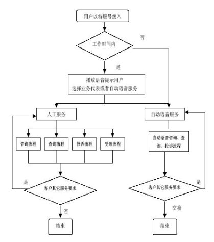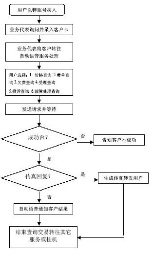 系統(tǒng)自動報受理人員工號,人工交互式受理方式。受理人員根據(jù)用戶要求從服務質(zhì)量標準數(shù)據(jù)庫、電費數(shù)據(jù)庫和其他相連的數(shù)據(jù)庫查詢資料,然后通過語音方式播報資料或送到用戶指定的傳真機或其他終端設(shè)備上。主要內(nèi)容如下: