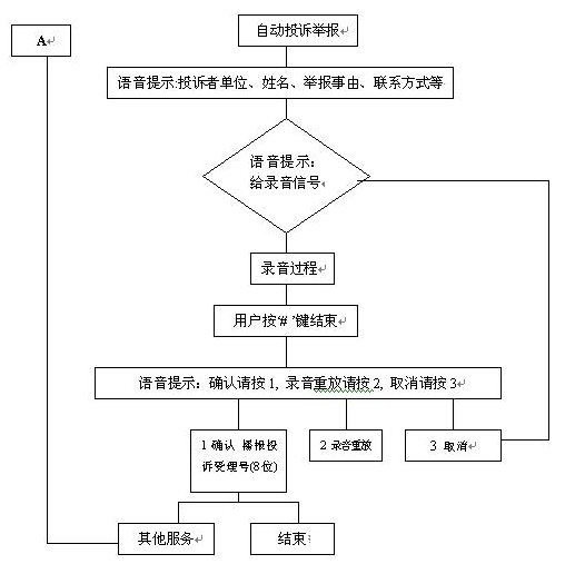 群眾通過自動(dòng)臺(tái)按照語(yǔ)音提示進(jìn)行投訴、舉報(bào)選擇錄音。自動(dòng)投訴舉報(bào)錄音流程如下: