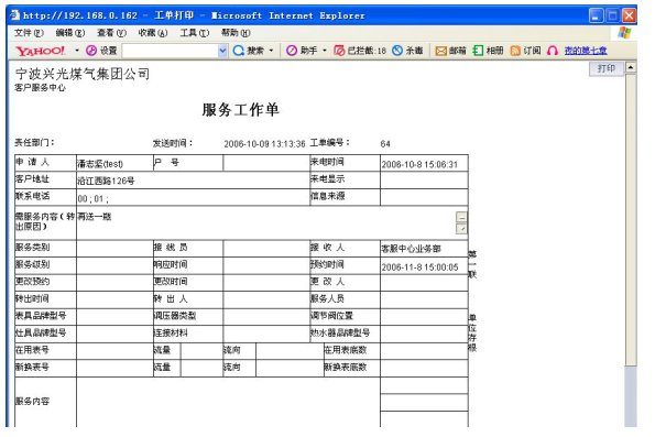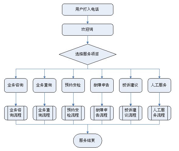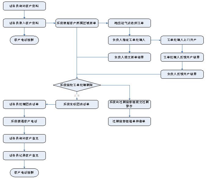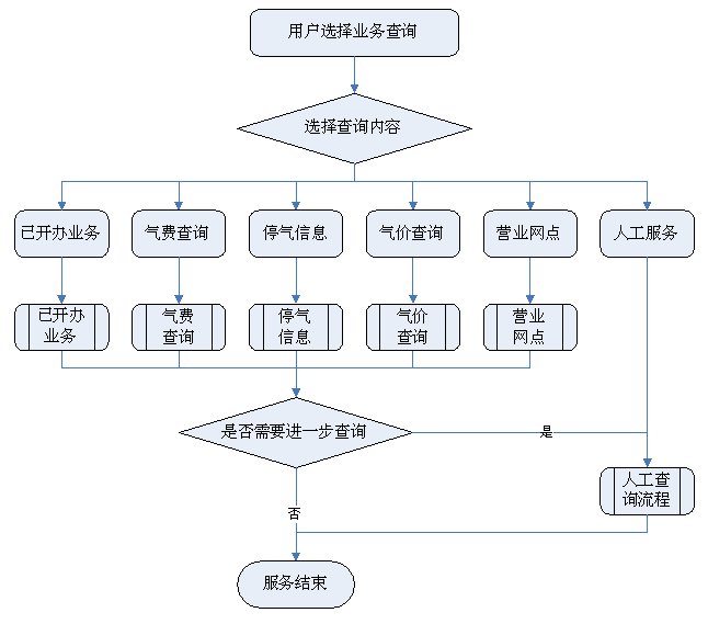 1)業(yè)務咨詢:用戶通過人工、自動語音等方式咨詢有關政策法規(guī)、資費標準、用氣常識、報裝方法等,系統(tǒng)以語音、傳真、Email、短消息等方式回復客戶。