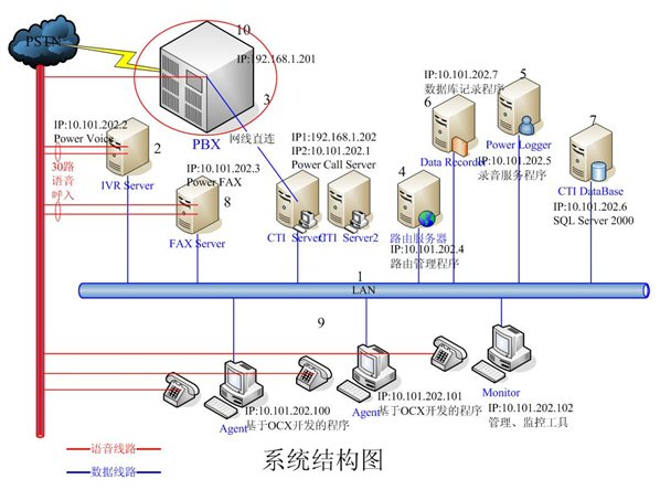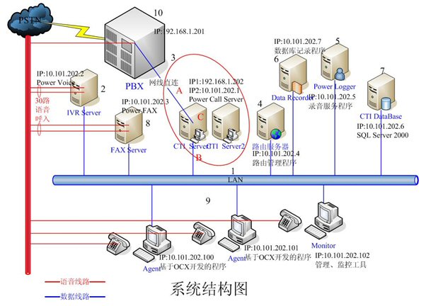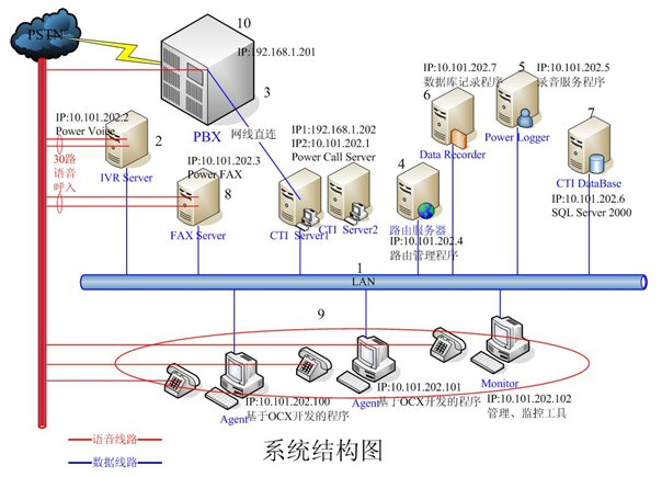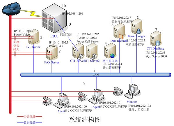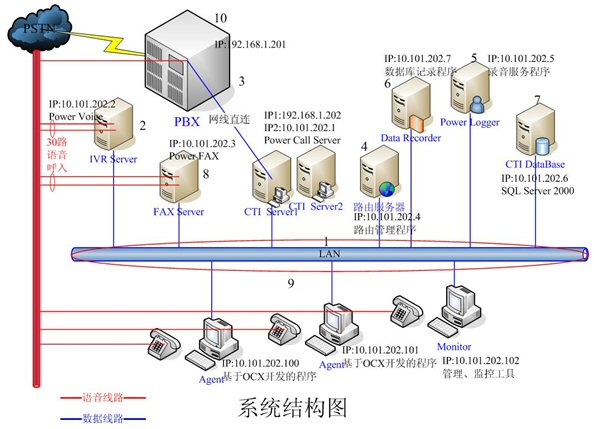 - IVR Server和FAX Server采用高品質的工控機,配置和軟件環(huán)境基本一樣。每臺機器均有30路語音接入,分別裝有一套Power