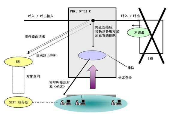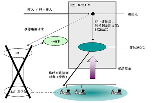 - 當RM出現(xiàn)故障(包括Server物理損壞、RM程序意外終止、網(wǎng)絡連接失效)時,RM將對電話的控制權交還給PBX,PBX根據(jù)自己的電話分配規(guī)則將電話分配到坐席。