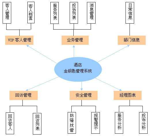 酒店金鑰匙管理系統(tǒng)通過客房電話與客人管理信息系統(tǒng)的結(jié)合,實(shí)現(xiàn)了酒店對(duì)在住客人服務(wù)事務(wù)的管理,最大限度地提高了酒店的服務(wù)效率、滿足客人的服務(wù)需求。系統(tǒng)包括VIP客人管理、業(yè)務(wù)管理、部門管理、回訪管理、安全管理、經(jīng)理圖表六大功能模塊,體系結(jié)構(gòu)如下: