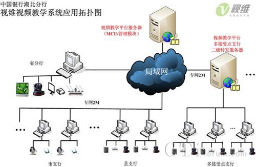 中國銀行湖北分行的視頻教學系統(tǒng)由服務器端和客戶端組成,服務器端軟件部署在省分行中心機房,配置2臺服務器,對于接受點超過5個的分支機構配置二級轉發(fā)服務器,共支持全省各支行及支行內(nèi)多個客戶端同時在線,負責所有培訓的召集、音視頻交互、加密等工作,各支行通過WEB方式即可實現(xiàn)客戶端軟件的自動安裝與升級,輕松實現(xiàn)實現(xiàn)省分行以及各支行共77余個接受點的高清音視頻視頻教學。同時為中國銀行湖北分行的視頻教學系統(tǒng)配置異構兼容模塊,支持與其他視頻會議及軟、硬件視頻教學系統(tǒng)無縫融合,避免重復投資造成的浪費。網(wǎng)絡拓撲圖如下: