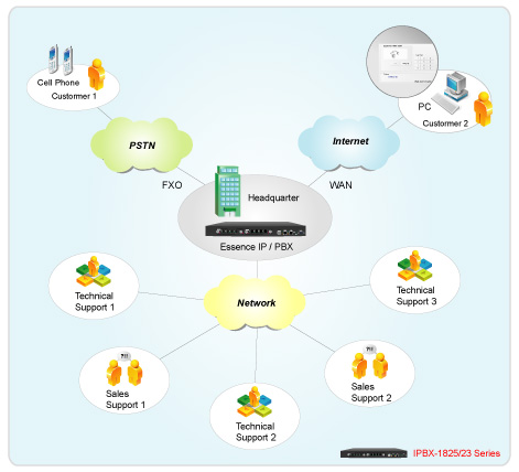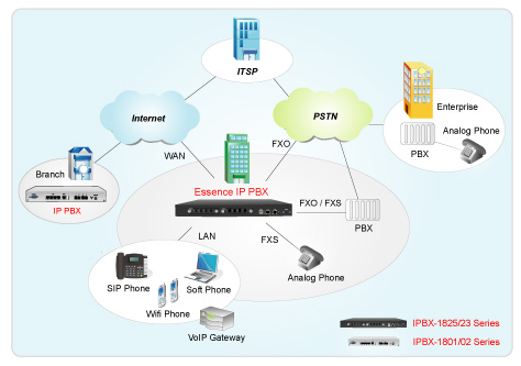 如圖所示,Essence IPBX 系列可透過內建之FXO或是ISDN接口與公共電話網(PSTN)或基于傳統(tǒng)PBX的企業(yè)電話網連接在一起。